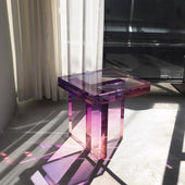 Crafted with exceptional finesse, the coffee table features a unique and alluring half-transparent design. The surface of the table is adorned with a stunning purple-pink gradient, reminiscent of a gentle twilight sky, adding a soft and dreamy ambiance to your living room. This exquisite coloration creates a seamless transition between transparency and elegance, casting an ethereal glow that captivates the eyes of anyone who beholds it.